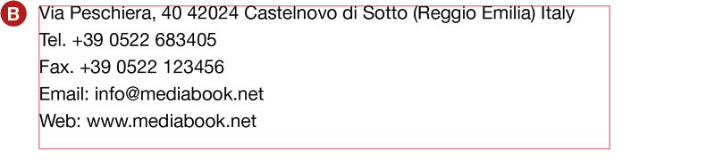<descrizione><indirizzo>Via Peschiera, 40 42024 Castelnovo di Sotto (Reggio Emilia) Italy</indirizzo> <tel>Tel. +39 0522 683405</tel> <fax>Fax. +39 0522 123456</fax> <email>Email: [email protected]</email> <web>Web: www.mediabook.net</web></descrizione></record>