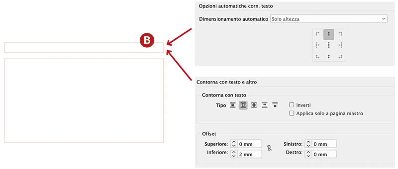 Per visualizzare tutto il contenuto occorre applicare al campo che ha un numero di righe variabile (B) e prima dell’impaginazione automatica, uno stile oggetto con Dimensionamento Automatico solo Altezza (si trova in Opzioni automatiche corn. testo) e Contorna con testo offset inferiore.