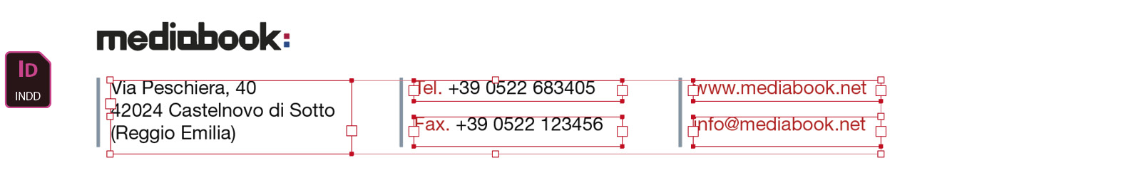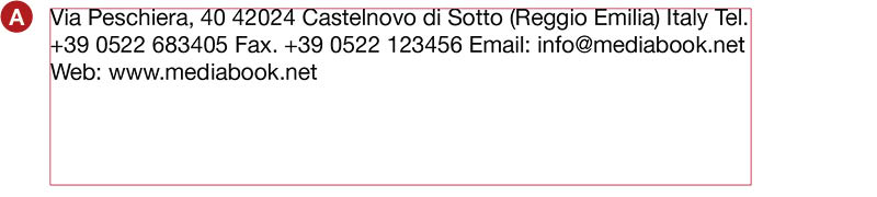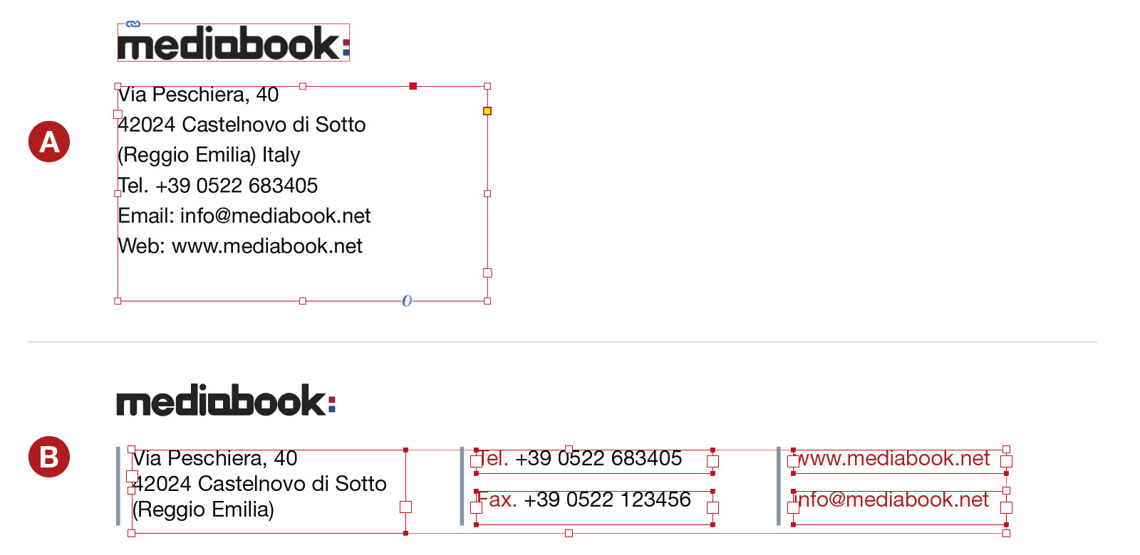 Di solito le informazioni di contatto sono composte da indirizzo, recapiti telefonici, email, web e vengono scritte o tutte in un unico campo di testo (A) o separate in tanti singoli campi (B) in base alla grafica.
