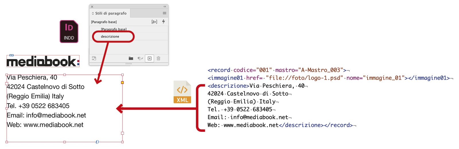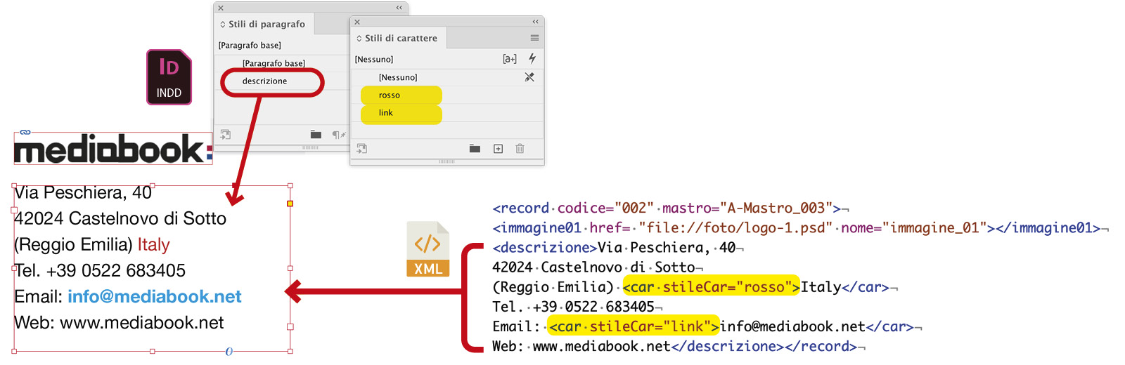 Per realizzare l’esempio occorre inserire nella struttura XML i TAG interessati, in questo caso sono indirizzo, telefono, fax, email, web, poi in InDesign nominare ciascun campo con un TAG associato alla struttura XML. Consultare InPagina – Taggatura campi.