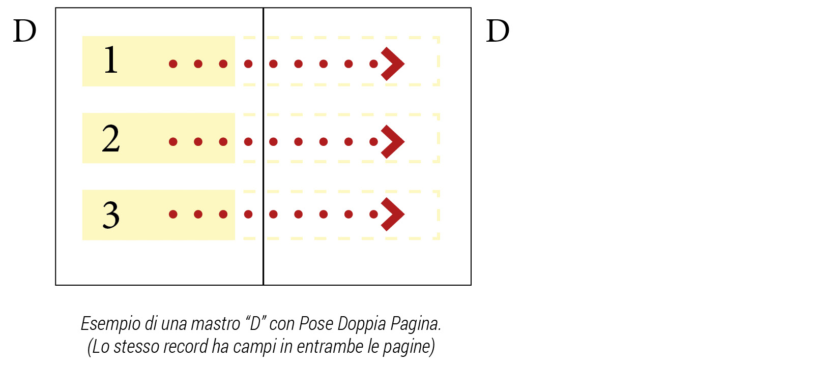 Se i record devono essere posizionati in modo differente tra pagine destre e sinistre, ma la quantità di record per pagina deve rimanere identica, dobbiamo utilizzare pagine mastro affiancate e poi modifichiamo le pose interessate.