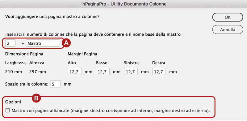 Si apre una finestra fluttuante in cui inserire il numero di colonne desiderato (A). Il valore deve essere compreso tra 1 e 9. È possibile personalizzare altri valori cambiandoli negli appositi campi.