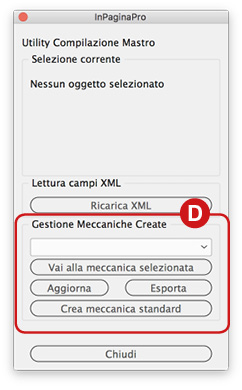Deselezionare tutto e il pannello Utility Mastro cambia aspetto, generando automaticamente un elenco con le meccaniche create (taggate) per facilitare alcune operazioni (D).