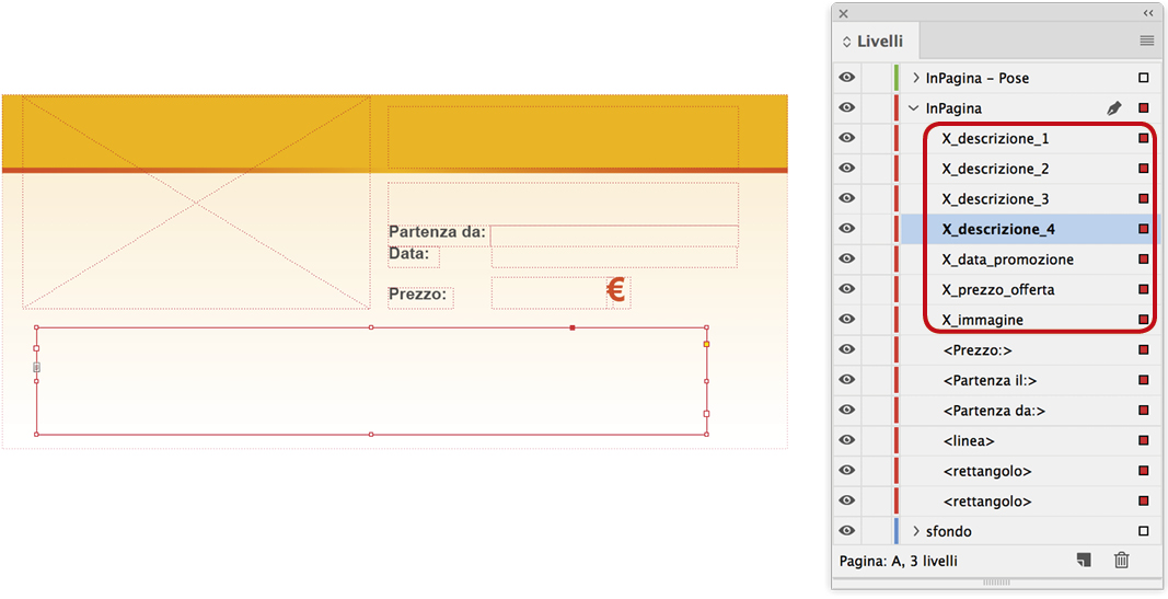 Il prefisso “X” è un valore che verrà sostituito automaticamente da InPaginaPRO con il numero della posa con cui è ordinato il record impaginato, la restante parte è il nome del campo che deve essere inserito. Questo nome deve essere preso tra quelli presenti nel file XML, scritto esattamente allo stesso modo, comprese le lettere maiuscole e minuscole se presenti e soprattutto non è possibile nominare più campi (i box) con lo stesso nome. Qualsiasi altro elemento che abbia puramente funzione grafica non deve avere nessun nome, tantomeno quello di un campo.