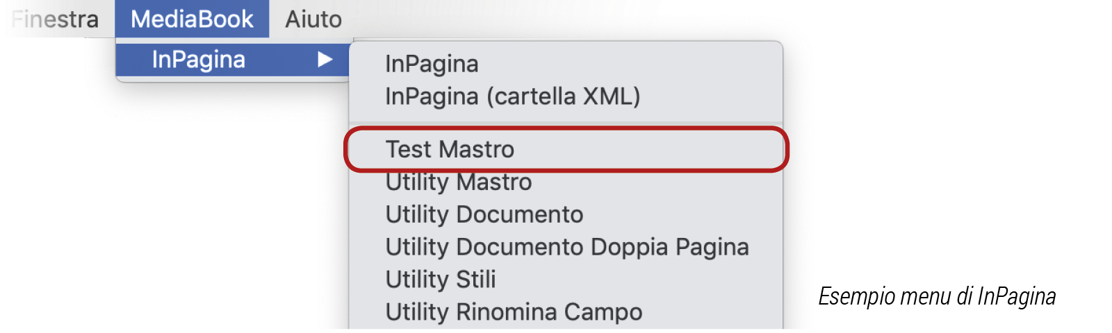 Aprire il documento mastro da usare con InPagina e avviare la verifica selezionando dal menu principale Mediabook > InPagina > Test Mastro.